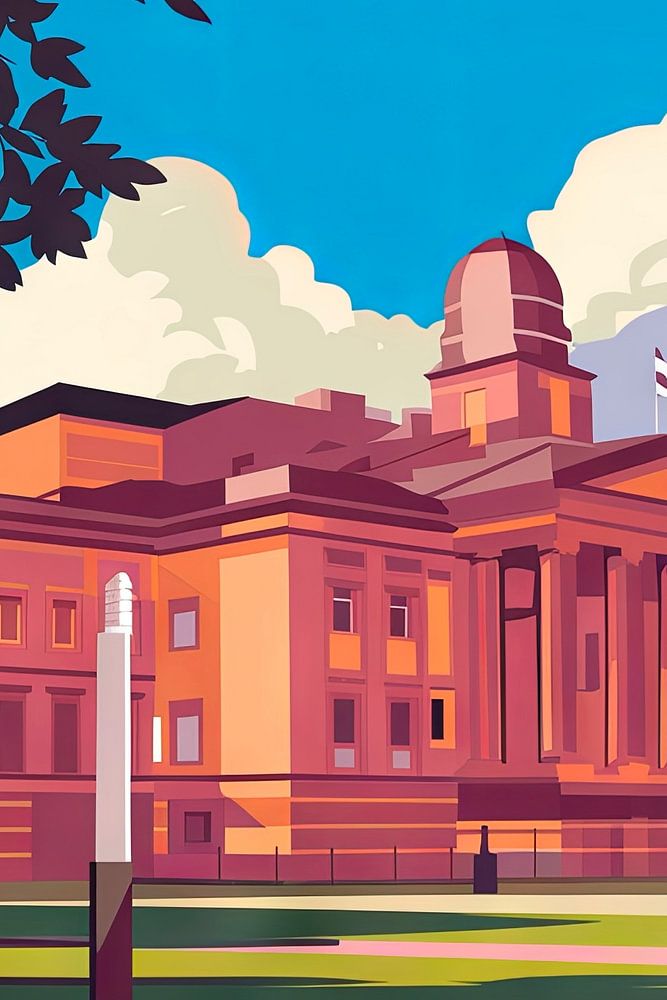Under a blooming, bright blue sky, a majestic building rises up with warm, orange tones, telling stories from a bygone era. Massive columns and magnificent details give the building an imposing presence, while the gentle greenery of the park is inviting and harmonises the site. A truly impressive panorama of Glasgow!