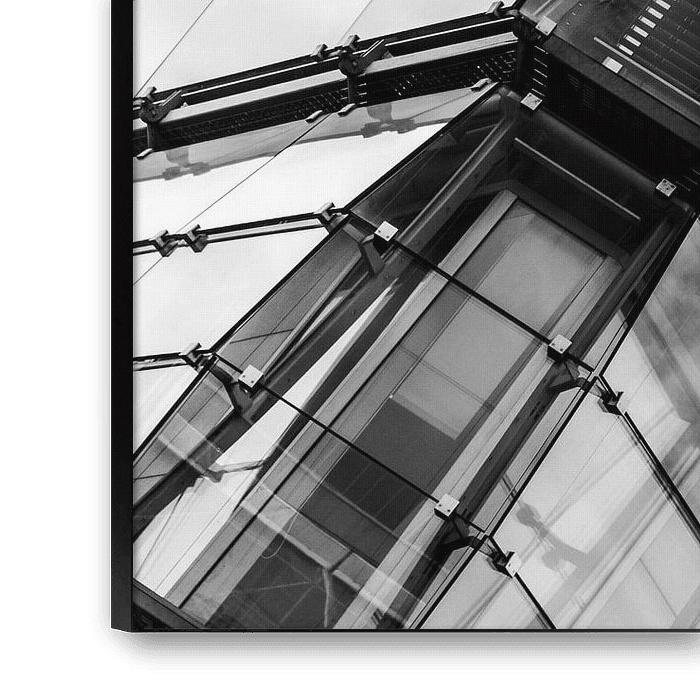 The artwork shows a close-up of a modern glass façade at Potsdamer Platz in Berlin. The structure consists of large glass panels held by a precisely constructed metal frame. The geometric arrangement of the elements creates an exciting pattern that is further enlivened by the reflections of the sky and clouds. The façade thus acts not only as an architectural element, but also as a projection surface for its surroundings.