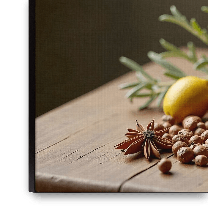 Buy the photo Glass jug of golden yellow oil surrounded by spices and citrus on wooden table by Markus Gann on canvas, ArtFrame, poster and wallpaper, printed on demand in high quality.