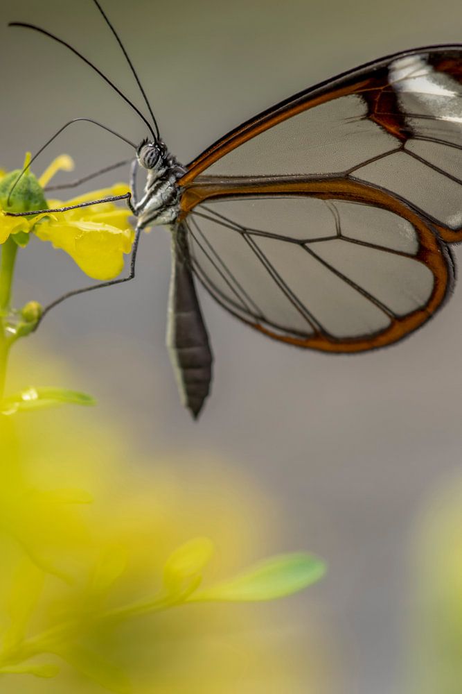 Glass wing butterfly (Greta oto) on a yellow flower. Bokeh background. Butterfly with transparent wings on a yellow flower. Tropical butterfly in summer.