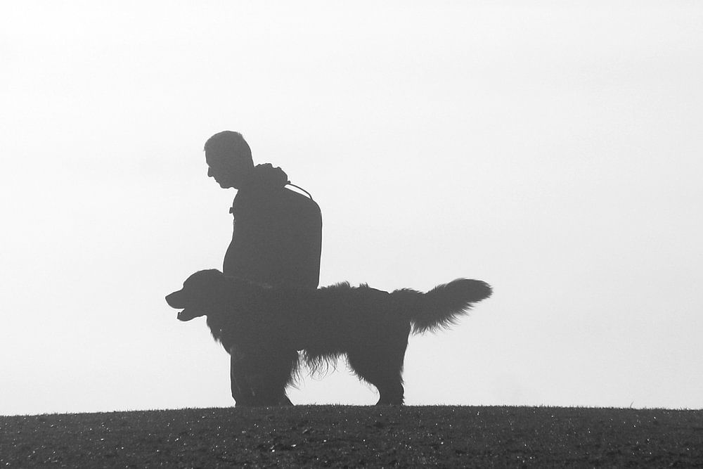 At the top of the Glastonbury Tor a man and his dog are photographed in silhouette with the mist of Avalon in the background. Glastonbury Tor, Somerset, England.
