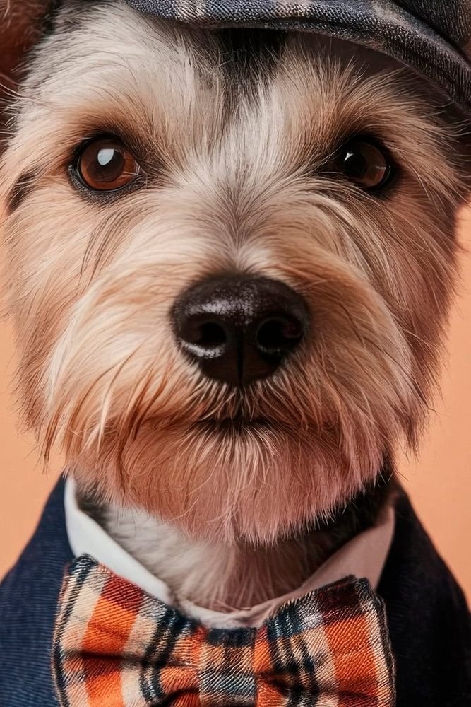 A charismatic Glen of Imaal Terrier presents himself in smart attire: an elegant suit and a tasteful bow adorn his charming character. The smart hat adds a touch of sophistication. With his loyal, large eyes, he radiates both intelligence and a playful character - a true gentleman on four paws.