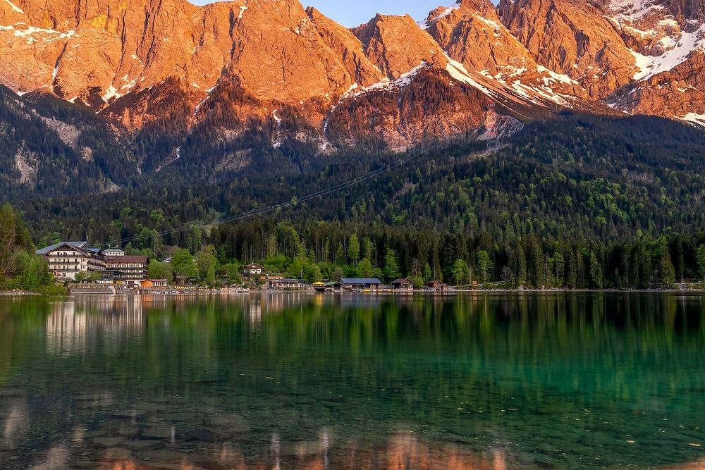 Buy this landscape artwork Glowing mountains at the Eibsee by Teresa Bauer on canvas, ArtFrame, poster and wallpaper, printed on demand in high quality.