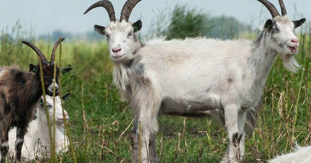 Goats in the meadow. But a special laughable special goat. Purely by coincidence, I was able to take a photo like this. A truly special nature photo that will be viewed by many with a smile.