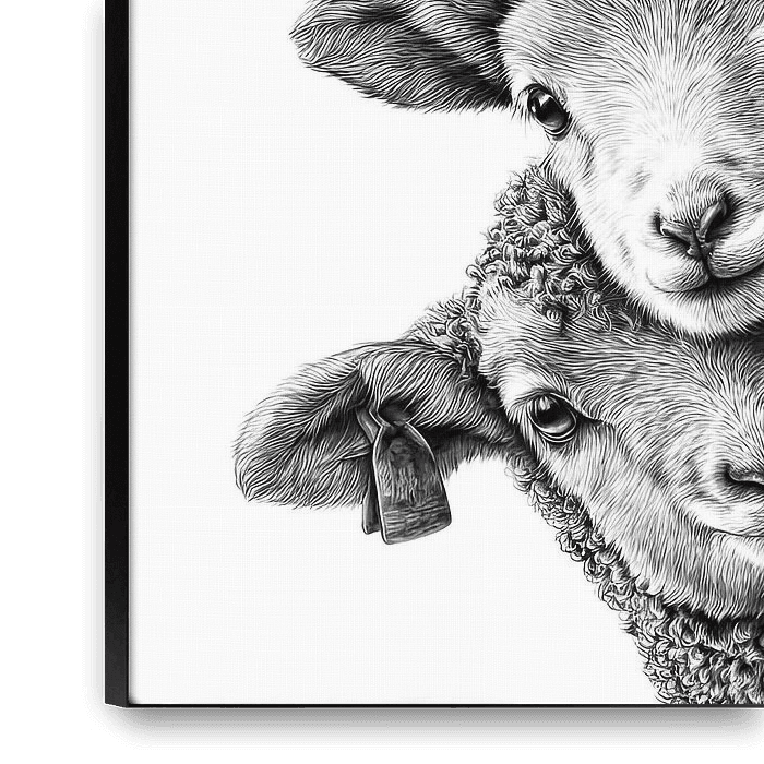 This sweet black-and-white illustration shows a curious goat family peeking from behind a rustic wooden fence. Three faces appear in a stacked arrangement, creating a friendly, whimsical composition that feels both playful and comforting. Fine engraved-style linework defines the goats’ soft fur, gentle eyes, and rounded muzzles, while…