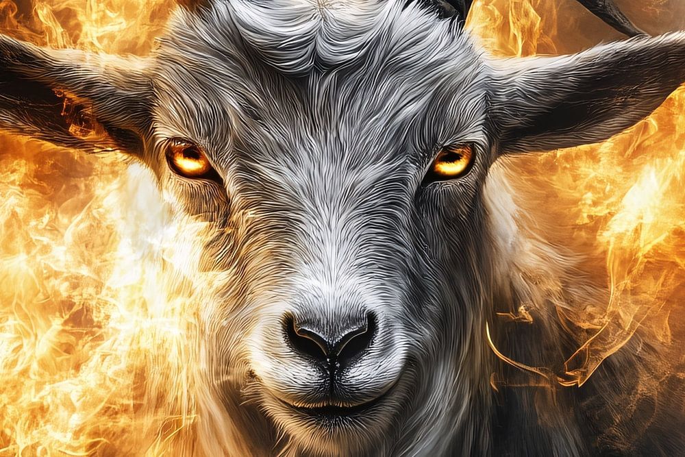 This image shows an impressive goat with fiery eyes, surrounded by a dramatic flame effect. The design exudes power and mystery, perfect for those looking for a bold artwork that will attract attention. The realistic details in the fur and horns bring the goat to life, while the fiery frame adds a sense of energy and power. This piece fits well in a modern office space or bedroom, where it can act as a powerful eye-catcher. A visual spectacle that adds a unique atmosphere to any room.