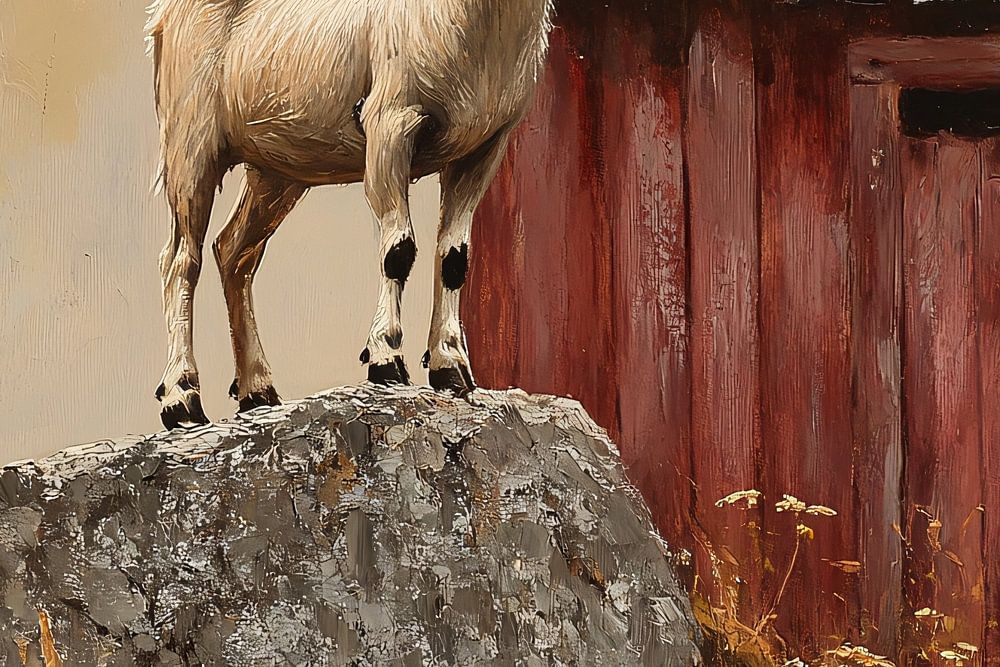 This painting captures a rustic scene of the countryside, in which a goat stands confidently atop a weathered rock with an old, red barn in the background. The warm, earthy tones and careful brushstrokes give the scene a nostalgic feel, as if it were a glimpse of a simple, rural life. The goat exudes a sense of pride and independence, while the surrounding vegetation and faded colours of the barn add to the authentic character of this artwork. Perfect for lovers of rural charm and animals, this painting adds warmth and character to any room.