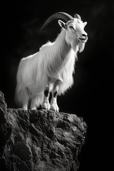 A majestic animal rises in a dramatic pose on a steep cliff, surrounded by mysterious mist. The elegant white coat and distinctive horns give this goat an aura of grandeur and strength. Ideal for a living room or a modern office, this painting brings a combination of closeness to nature and timeless elegance to any room.