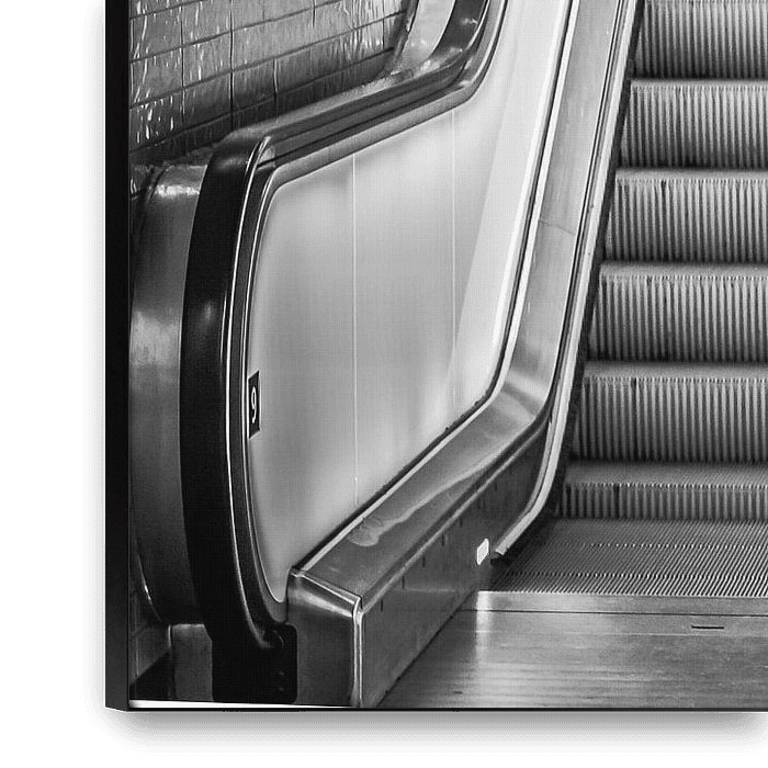 Going up, a black and white photograph of an escalator. This photo was taken beneath the central train station in Amsterdam.