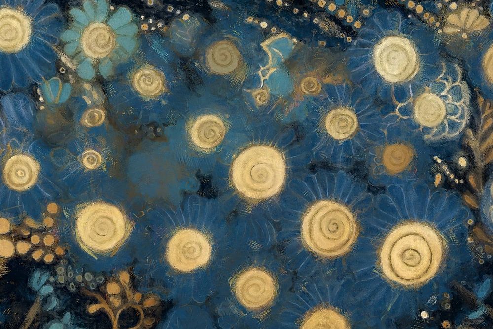 This work shows a collection of gold and blue flowers scattered across the canvas. The flowers are detailed with circular patterns and dots, giving a sense of texture and depth. Rays of light can be seen in the background, creating a dynamic and radiant effect.