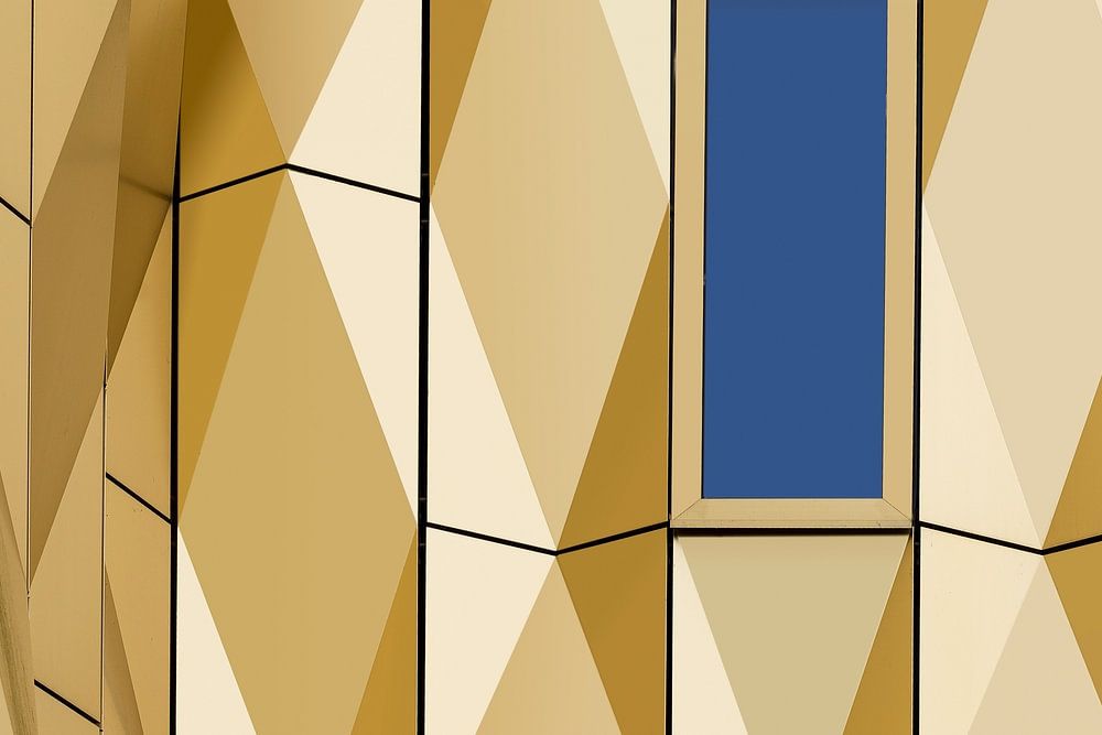 In Tiel stands this fantastic architectural structure. The facade seems to be made of gold. The patterns are geometric and almost graphic. The windows reflect the blue sky, which forms a beautiful contrast with the golden yellow facade. This modern style in architecture is a true feast for the eyes.