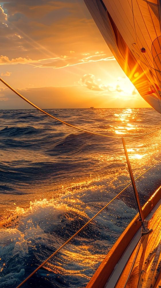 The sailboat cuts powerfully through the waves, under a sky that changes from azure blue to gold and orange due to the sinking sun. The reflection of the evening sun on the surface of the water creates a path of sparkling light that leads to the horizon. The waves break against the side of the boat, creating a symphony of splashing water, providing a dynamic contrast to the peaceful sky above. The sun's rays shine through the sail, sharply outlining the contours of the ropework and giving the whole an ethereal look.