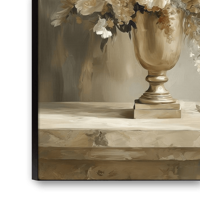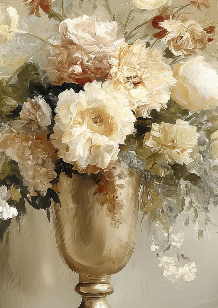 An impressionist painting shows a gold-coloured vase with a wide, round base on a light-coloured wooden surface. The vase contains a lush bouquet of flowers in shades of cream, beige and light brown, complemented by green leaves and delicate stems. A single white petal lies on the right of the wooden surface. The background is neutral and softly blended, allowing the vase and flowers to take centre stage. The composition is balanced, harmonious and conveys a calm, elegant atmosphere. The visible brushstrokes and the texture of the flowers and the wood give the picture depth and expression.