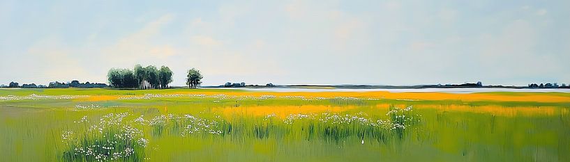 Gouden Band Weide - Dit landschap ademt ruimte en zachtheid — een breed, laag liggend uitzicht waarin een uitgestrekte bloemenweide en een smalle waterbaan elkaar afwisselen als twee noten in een eenvoudige melodie. Het is een bloemenveld schilderij dat niet schreeuwt, maar fluistert: eerst de groene massa van het gras, vervolgens…