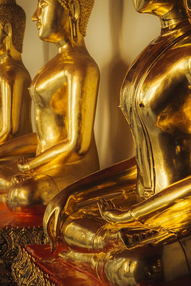 The golden Buddha statues of a Thai temple complex are presented in soft light, sitting side by side on ornately decorated pedestals. The gleaming surface reflects the spiritual atmosphere and religious heritage of Thailand. The scene conveys harmony, tranquillity and the deeply rooted Buddhist culture that is an important part of the country. The ornate decorations and traditional choice of colours make the motif a symbol of peace, meditation and inner growth. In modern living and working spaces, this picture provides inspiration, spiritual balance and elegance. Fans of Asian culture, temple art and high-quality photography will find a unique accent for their interior that reminds them of serenity and mindfulness every day.