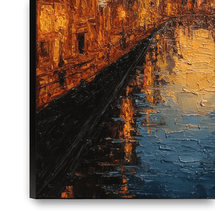 The city of Amsterdam seems to be bathed entirely in gold here. The sky is soft yellow and light blue, while the facades on both sides of the canal glow in warm tones. The water forms a mirror that makes the composition almost symmetrical.