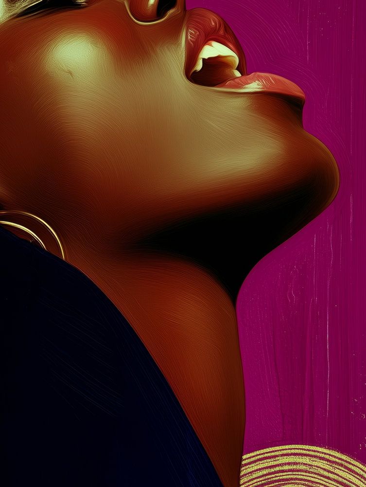 This expressive portrait shows an elegant woman in a powerful pose, confidently tilting her head backwards, radiating pure strength and grace. Her warm, golden-brown skin is enveloped in a dramatic play of light and shadow that makes her face stand out vividly. The closed eyes and relaxed posture convey an atmosphere of inner peace and self-confidence.