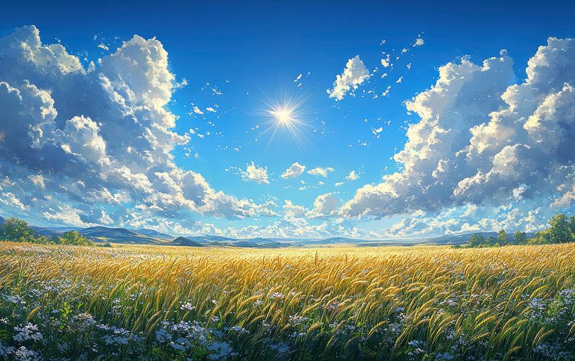 A breathtaking scene capturing the vast grasslands bathed in sunlight. The fluffy clouds scatter across the bright blue sky, while golden stalks of grass sway gently in the breeze, evoking a sense of tranquility and connection with nature's beauty.