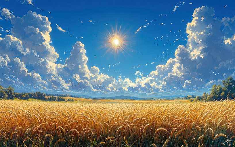 A breathtaking scene capturing the vast grasslands bathed in sunlight. The fluffy clouds scatter across the bright blue sky, while golden stalks of grass sway gently in the breeze, evoking a sense of tranquility and connection with nature's beauty.