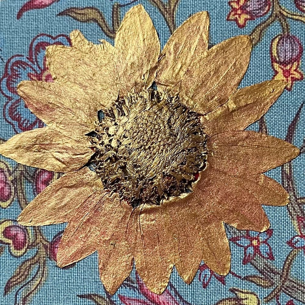 Featuring a vibrant colour palette, mainly gold with deep red tones. This artwork is framed by repeating sunflower motifs, giving depth and texture.