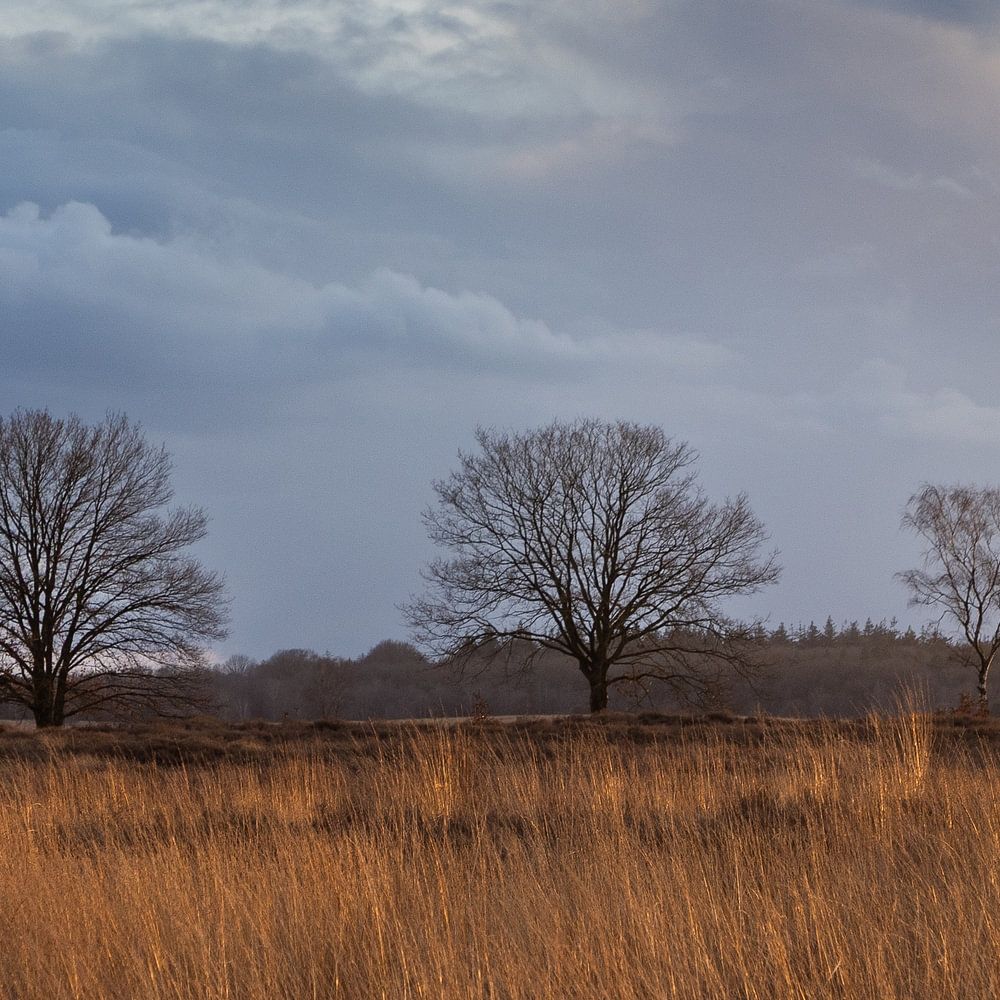 The Ginkel Heath landscape near Ede, in Gelderland in the Netherlands is a stunning display of golden grass under a vast sky. The tall, dry grass sways in the wind, its golden colour contrasting beautifully with the sky. The open savanna-like terrain is dotted with trees and framed by fluffy clouds, offering a sense of tranquillity and natural beauty.