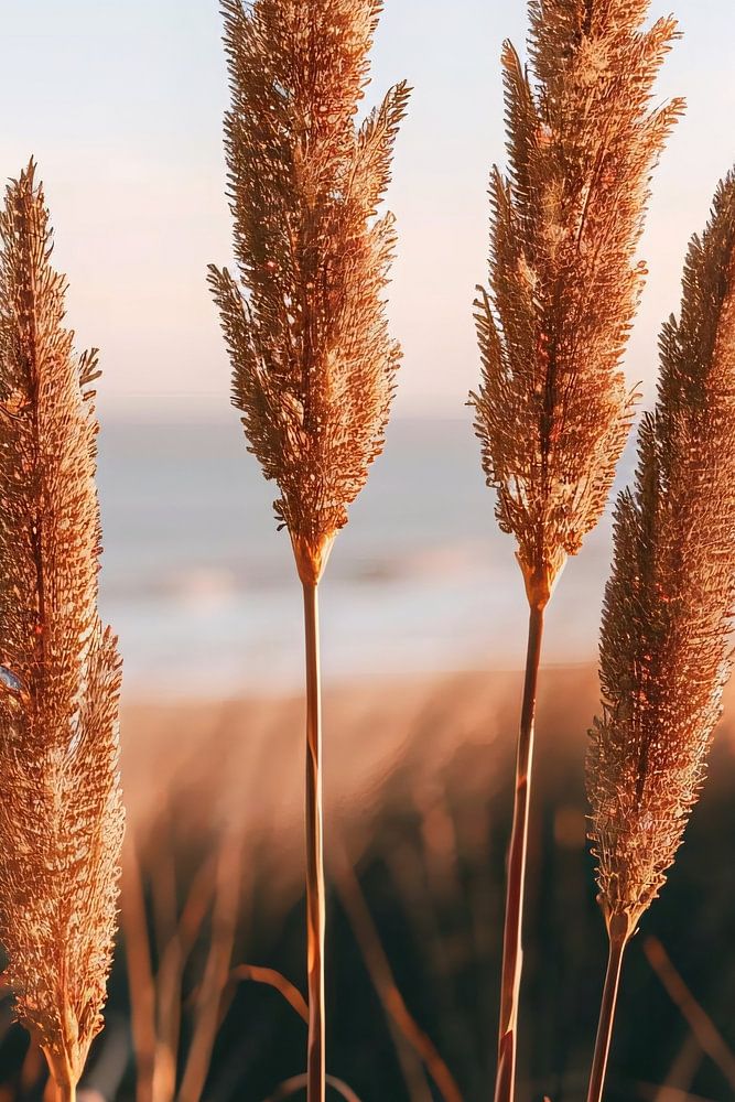 This stunning photograph captures the serene beauty of nature in all its glory. The golden grass stalks dance gently in the breeze as the sun slowly sets on the horizon. The soft colours of the sky and water create a sense of calm and peace. This picture is perfect for anyone looking for a touch of nature in their home or office. It is a reminder of the beauty that surrounds us and an invitation to slow down and enjoy the simple things in life.