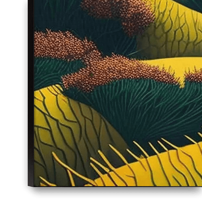 This vibrant landscape painting depicts gently rolling hills in rich shades of green and golden yellow, interspersed with warm, rust-coloured tufts of foliage. The scene evokes a peaceful rural setting, stretching gracefully to the distant, sunlit horizon under a bright, clear sky. Ideal for nature lovers and decorating enthusiasts,…
