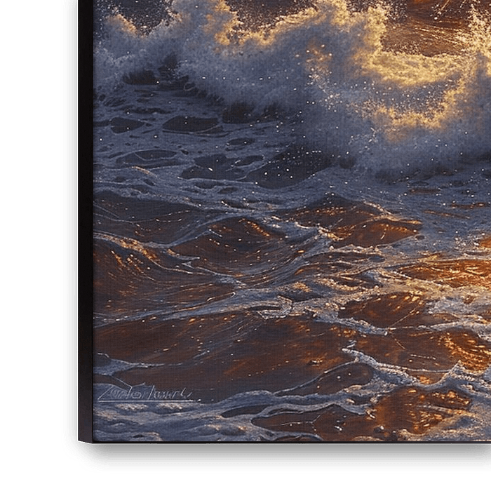 Discover "Golden Horizon", a work that captures the majestic power and beauty of nature. This work, depicts a breathtaking sunset over a raging sea, where every wave and cloud is drenched in the fiery gold of the setting sun.
