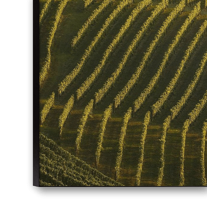 The image focuses on the rhythmic, cultivated geometry of the vineyards, where perfectly aligned rows of Nebbiolo vines carpet the steep, rolling hills.