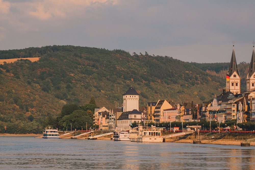 Golden hour over typical German village, Boppard, on the Rhine. Nice overview of the town with the church towers and mountains in the background. A small reflection in the water and the golden glow complete it