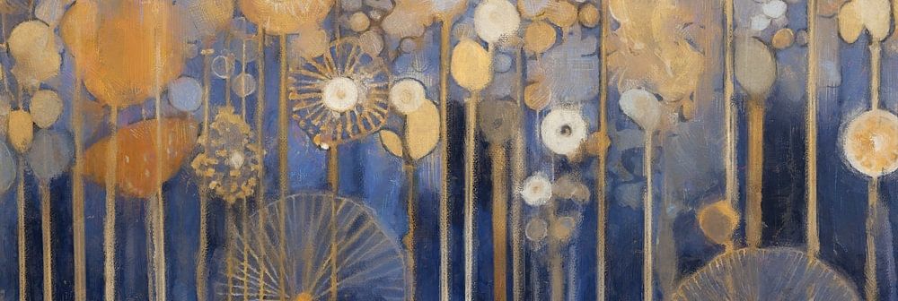 This work presents an enchanting scene of golden flowers stretching out against a rich, deep blue background. The flowers vary in size and shape, and their delicate, almost ethereal appearance is enhanced by the subtle, golden sparkles scattered throughout. The background consists of different shades of blue, which contrast with the warm gold colours of the flowers, creating a sense of depth and mystery. This piece is perfect for a room where you want to add a calm yet intriguing atmosphere, such as a study or a reading corner.