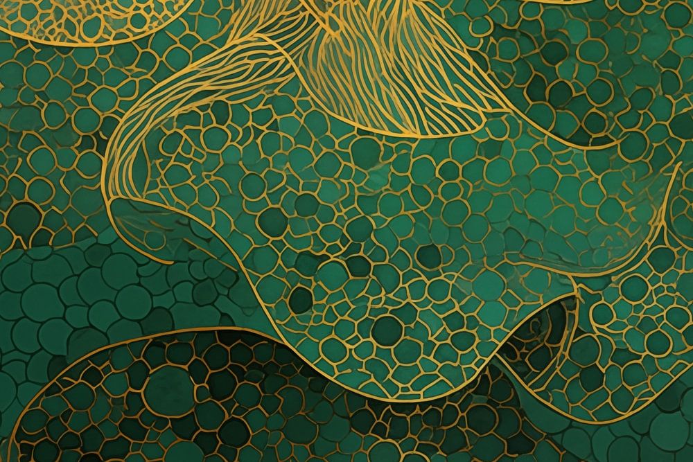 This work shows a network of delicate golden lines and patterns against a rich green background. The organic shapes and texture of the lines are reminiscent of foliage and nature, evoking a sense of serenity and harmony.