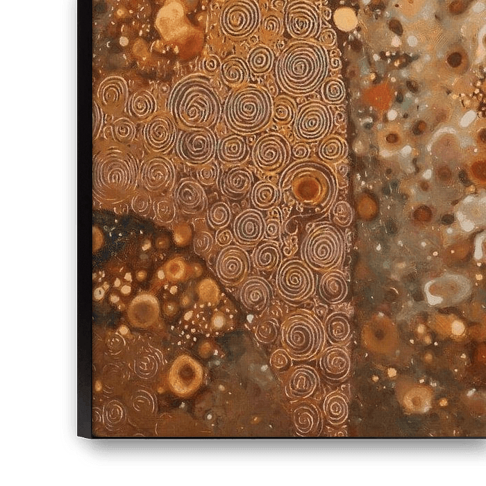 Fine gold spirals snake like mineral veins through a tapestry of turquoise dots and copper shimmers. Layered circles meet in a powerful contrast between warm metallics and cool aquatic tones. Inspired by swirl patterns in rocks, the composition offers dynamic relief that captures and reflects light. The subtle depth and sparkling accents give any space a refined, organic feel and invite ever-new discoveries.
