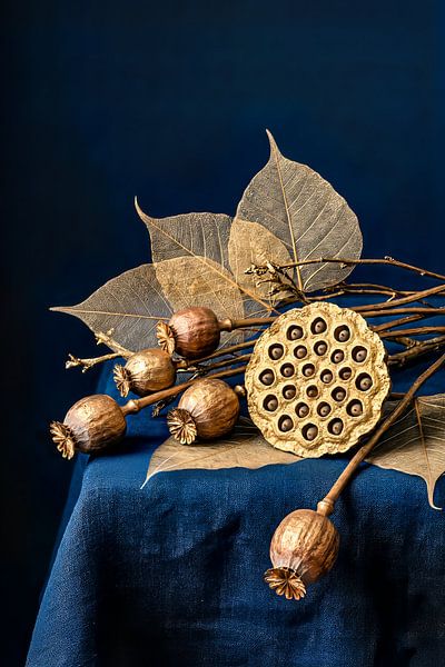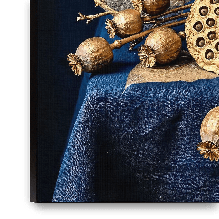 A luxurious still life that captures the beauty of nature in precious gold. A perfect contrast against a deep blue background for modern elegance.
