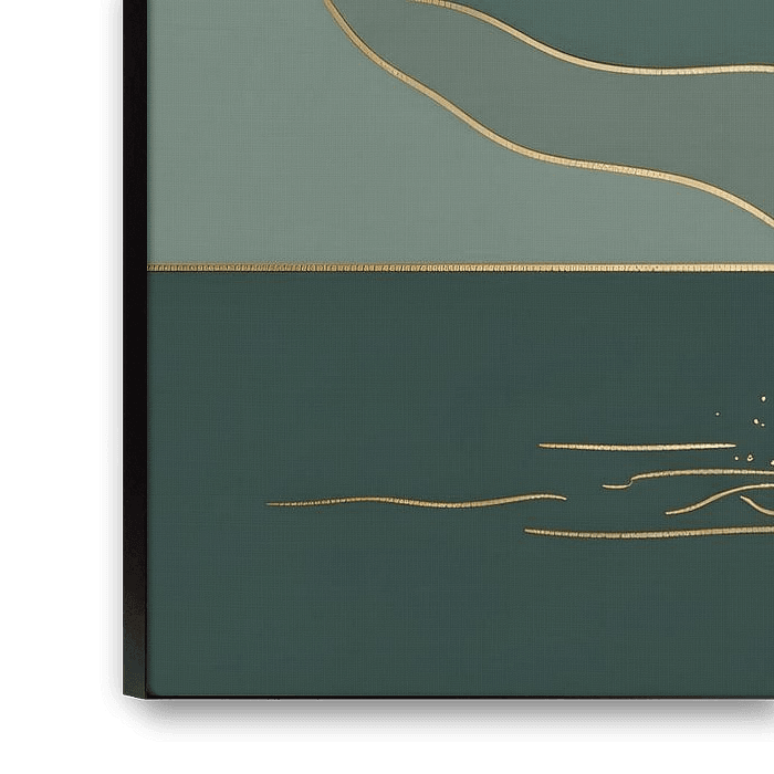 A minimalist line art of an orca leaping from the ocean, drawn in elegant golden outlines against deep green waves and mountains. A glowing golden moon illuminates the scene, blending marine life with abstract elegance. Perfect for modern interiors seeking a refined, nature-inspired artwork with a luxurious touch.