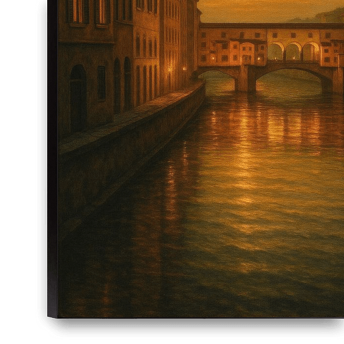 Buy this landscape artwork Golden Ponte Vecchio Reflection – Florence Sunset Harmony by Travel Shop on canvas, ArtFrame, poster and wallpaper, printed on demand in high quality.