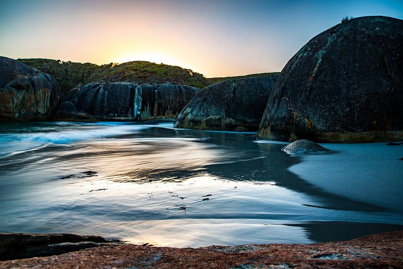 An atmospheric long-exposure photograph captures an Australian beach scene just after sunset. Smooth, ocean-shaped granite rocks in dark reddish tones are scattered across the foreground, midground, and background, their soft forms reflecting the power of nature. In the midground, a shallow, water-covered stretch of sand mirrors the…