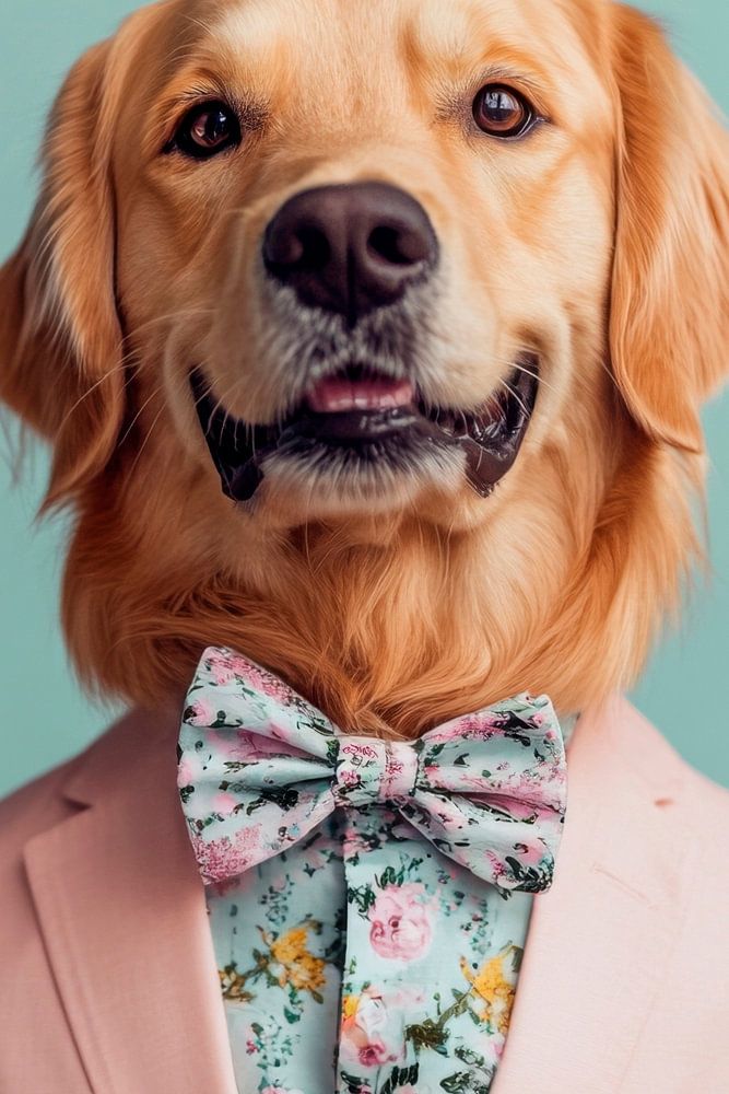 In an elegant suit with a chic bow tie, this golden retriever radiates charm and joy. His soft, golden coat shines in the light, while his playful eyes betray curiosity and friendship. Ready for any adventure, he embodies the perfect mix of style and carefree joie de vivre. A real eye-catcher that takes hearts by storm!