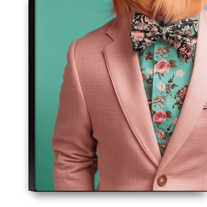 With a charming smile and elegant demeanour, this golden retriever radiates a carefree grace in his flowery bow tie and pink suit. His golden coat shines against the soft mint colour and immediately attracts attention. A true gentleman on four paws, ready for the next cheerful company!
