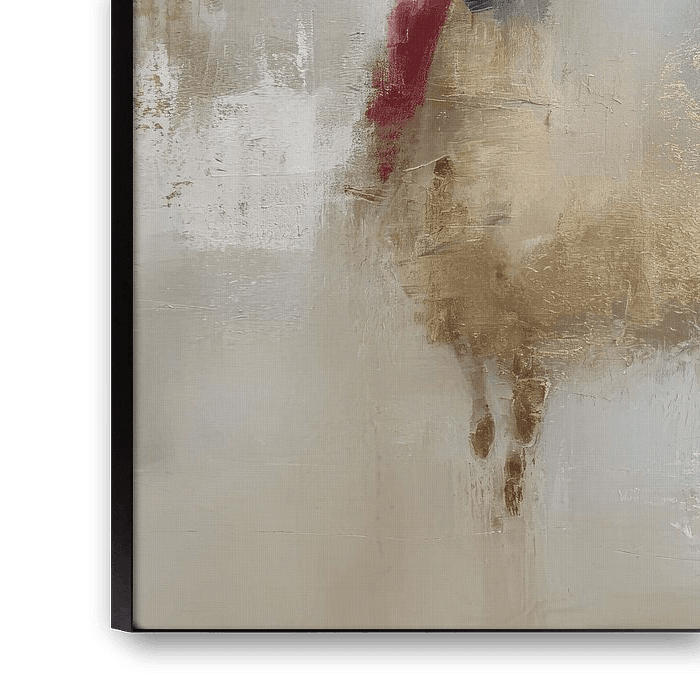 A woman captured in a moment of stillness: softly enveloped by light, mist and golden accents. Golden Silence exudes tranquillity, elegance and timeless sophistication. The subtle brushstrokes and the play of light and shadow bring a sense of movement, as if she is slowly disappearing from the canvas.