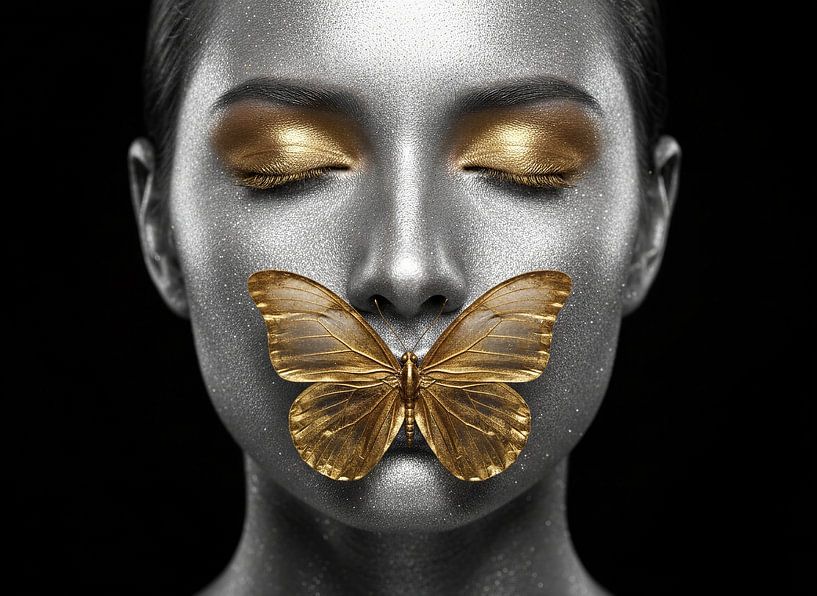 This work revolves around control. Not what is said, but what is deliberately left unsaid. A face, completely shrouded in silver-grey texture, rests with closed eyes in a state of almost unearthly calm. The skin seems more metal than flesh, more object than person. And right there, on the border between breath and voice, rests a golden…