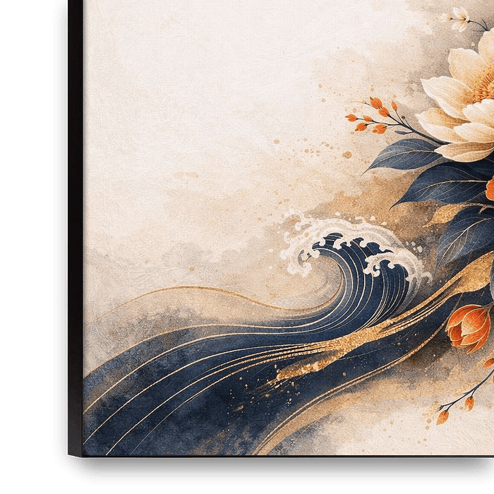 This elegant floral composition combines blooming peonies with flowing wave elements and a radiant golden sun backdrop. The warm orange and ivory petals contrast beautifully with deep navy tones, creating a sophisticated balance between light and shadow. Inspired by traditional Japanese art, this piece feels both cultural and…
