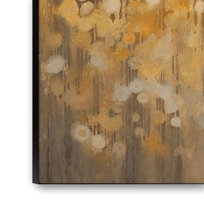 This work captures the warmth and brilliance of a golden sunrise, with numerous circles in different shades of gold and yellow dominating the composition. The vertical lines running through the work give a sense of movement and depth, as if the light of the sunrise is shining through a lush forest. The delicate balance between abstract and natural elements evokes a serene and luxurious atmosphere. Influences of the art deco style are subtly present in the geometric precision of the shapes and the sophisticated colour combination. This piece brings a sense of calm and elegance to any room, ideal for art lovers who draw inspiration from both nature and historical movements.