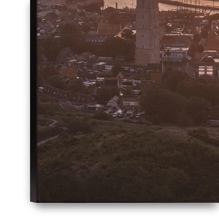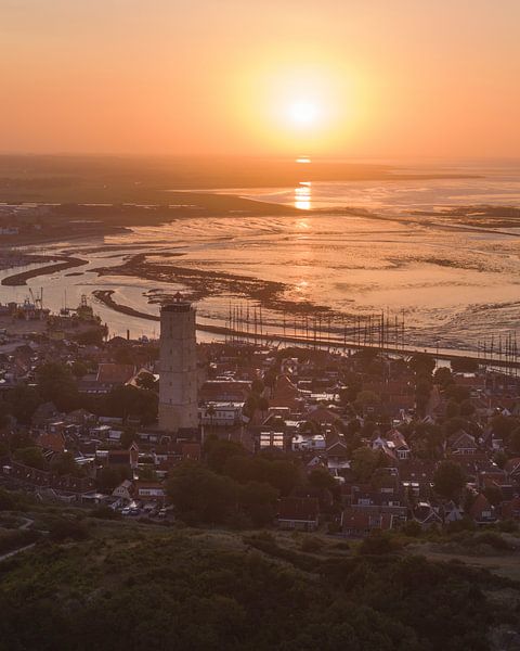 During the last moments of the day, the sun slowly sinks towards the horizon and Terschelling is bathed in a warm, golden glow. In this aerial photograph, the sunlight reflects off the vast mudflats, while the characteristic Brandaris lighthouse towers proudly above the village. The combination of sea, land and sky creates a harmonious…