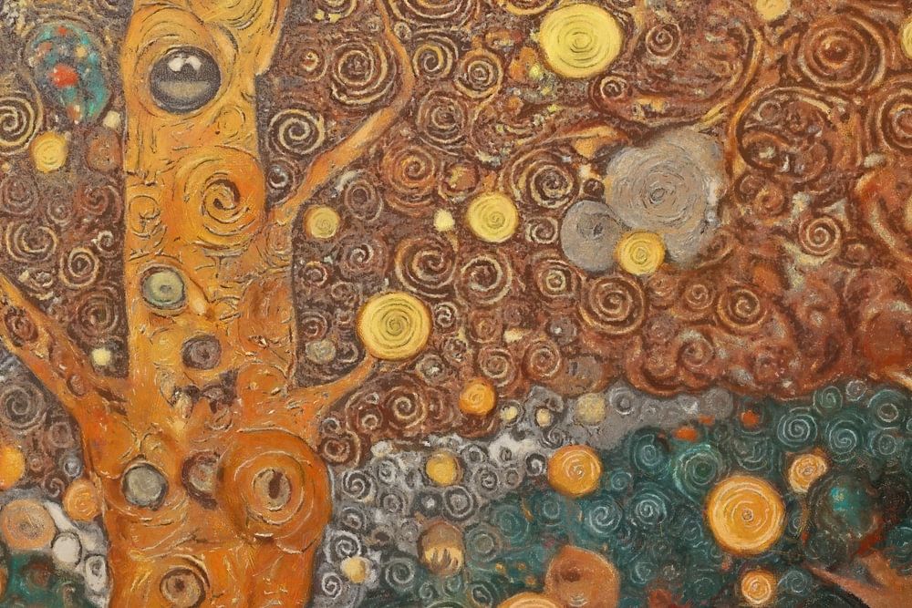 A sturdy tree trunk in warm golden brown tones forms the heart of this work, surrounded by thousands of delicate spirals that shimmer like sparks of light in an abstract forest. Warm copper-coloured rings flow into each other and are contrasted by cool turquoise tips, creating an organic harmony and subtle depth. Layered circle motifs and thin lines catch the light differently each time, revealing new details at every glance.