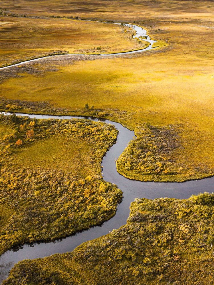 A breathtaking high-angle shot capturing the graceful, snake-like curves of a river as it cuts through the vast, golden-hued tundra of Northern Scandinavia. The autumnal palette of the shrubland creates a warm contrast against the cool, reflective water and the rugged, overcast mountains in the distance. This image perfectly…
