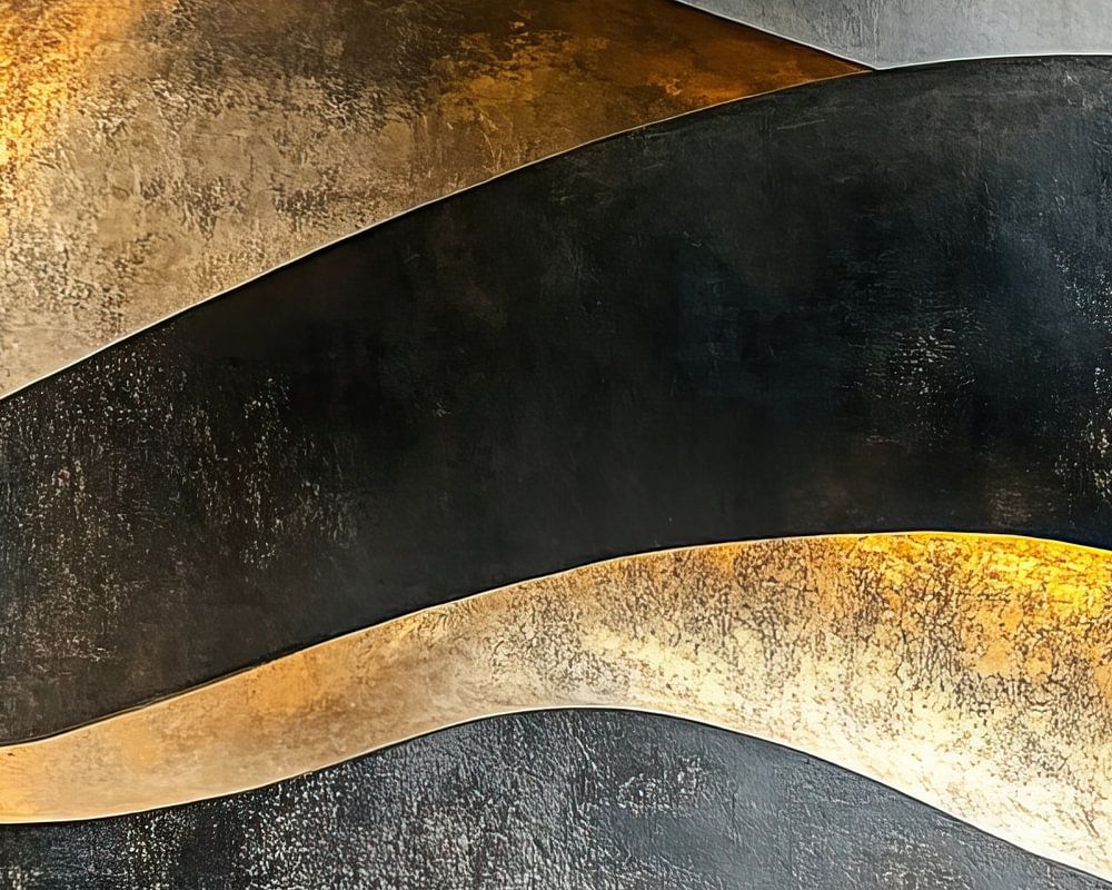 Details: abstract, painting, metal, gold, black, shapes, movement, texture, modern, art