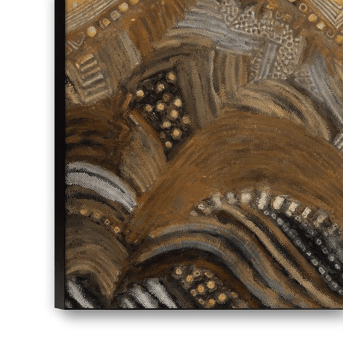 This work shows a pattern of wavy lines in shades ranging from deep brown to golden yellow. The waves move rhythmically across the entire surface, with detailed textures adding depth and complexity. The patterns in the waves evoke a sense of traditional textile motifs, but executed in a modern way.