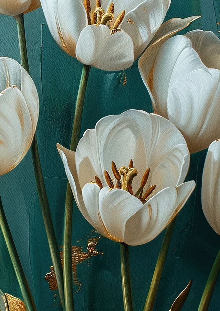 Details: white tulips, tulip painting, modern art, floral art, gold accents, detailed flower painting, natural decor, home decoration, wall art, floral aesthetic