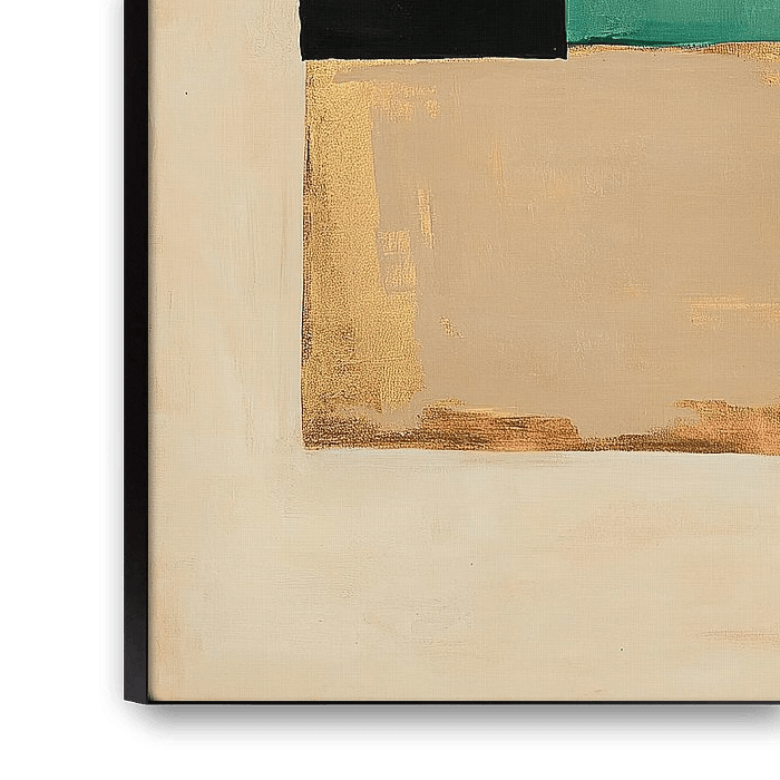 Minimalist painting in the style of white on a beige background, three rectangular colour fields in emerald green and black with gold leaf accents. One field is monochrome and the other two fields have subtle colour gradients. Minimalism, painting.